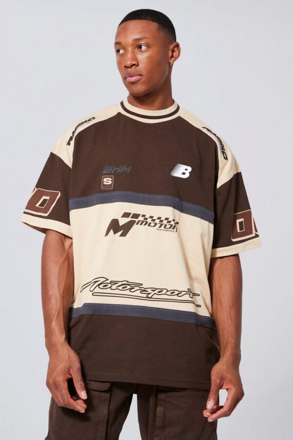 Home T-Shirts chocolate-oversized-panelled-motor-sport-t-shirt